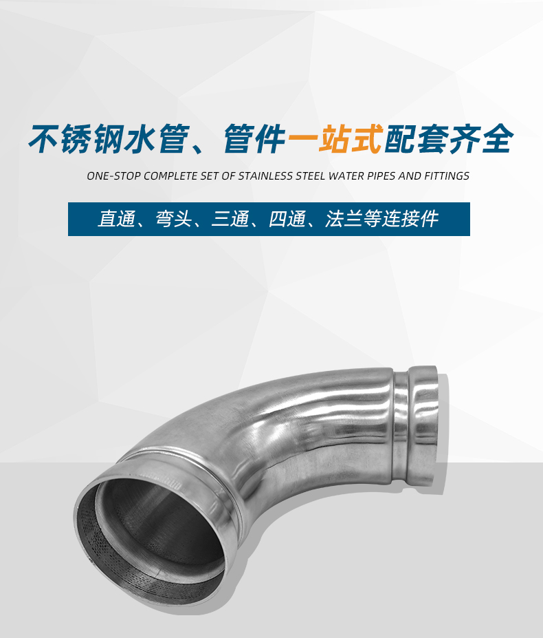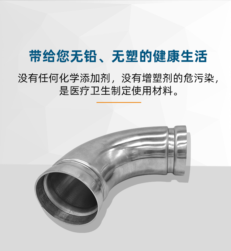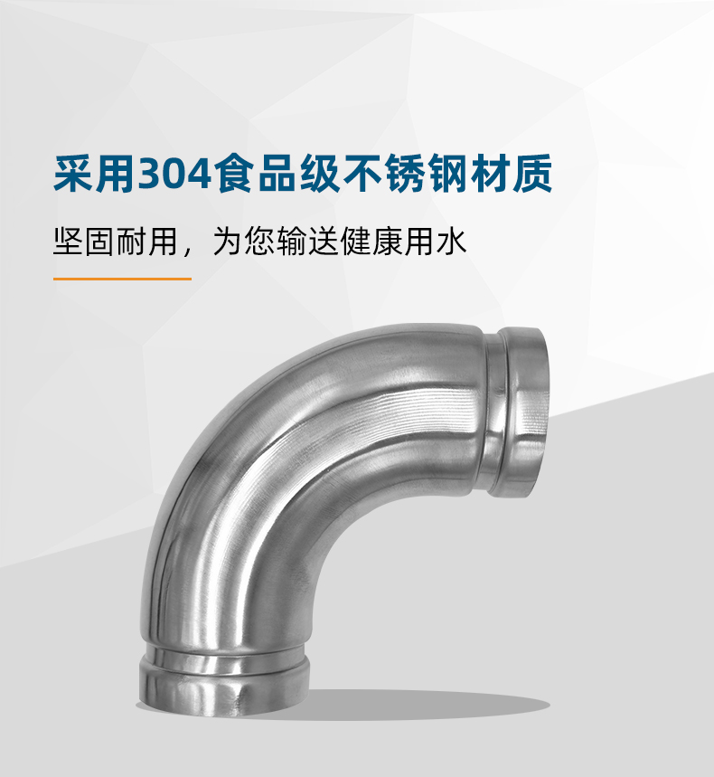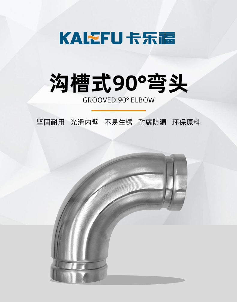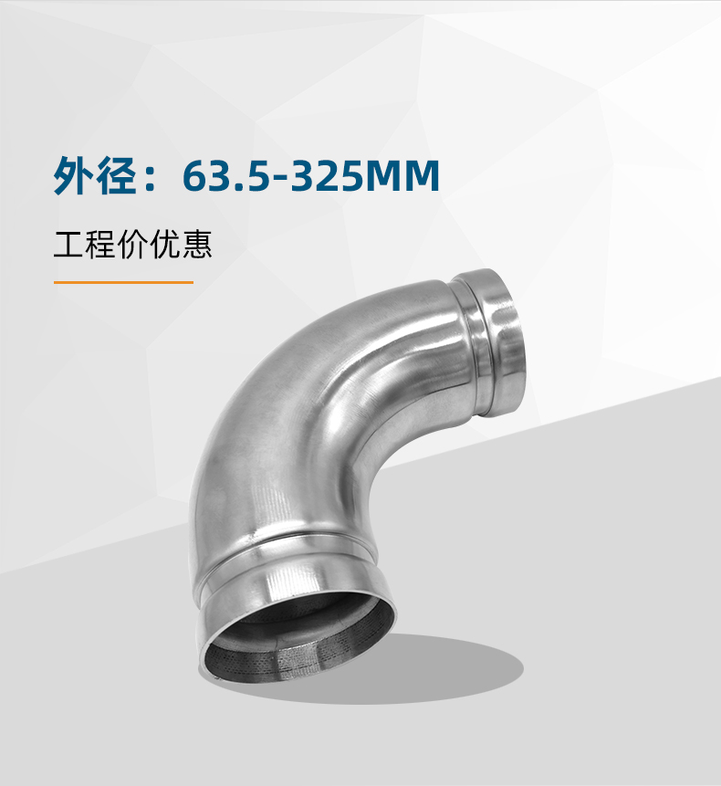 不銹鋼水管溝槽管件,溝槽式90°彎頭,90度彎頭,采用304 316L食品級不銹鋼材質,DN60-DN300通徑。本不銹鋼水管溝槽管件,溝槽式90°彎頭執行標準CJ/T 152-2016.