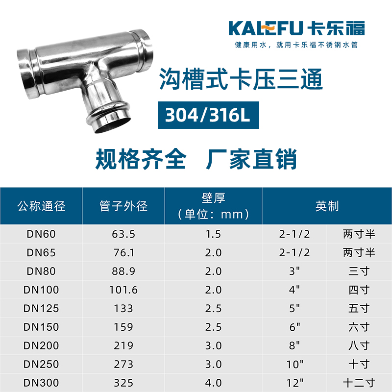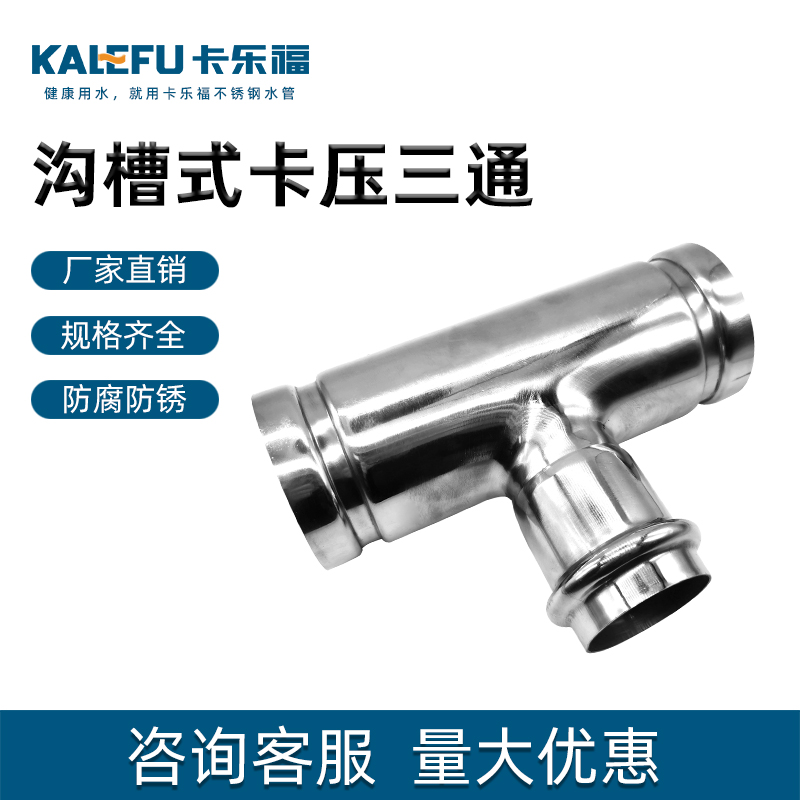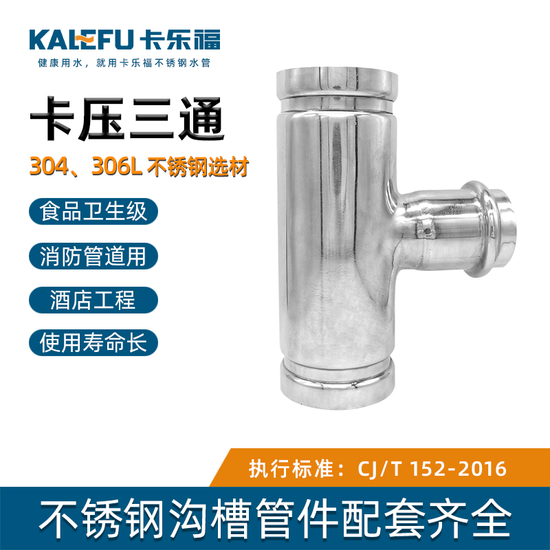 不銹鋼水管溝槽管件,溝槽卡壓三通,采用304 316L食品級不銹鋼材質,DN60-DN300通徑。本不銹鋼水管溝槽管件,溝槽卡壓三通執行標準CJ/T 152-2016.