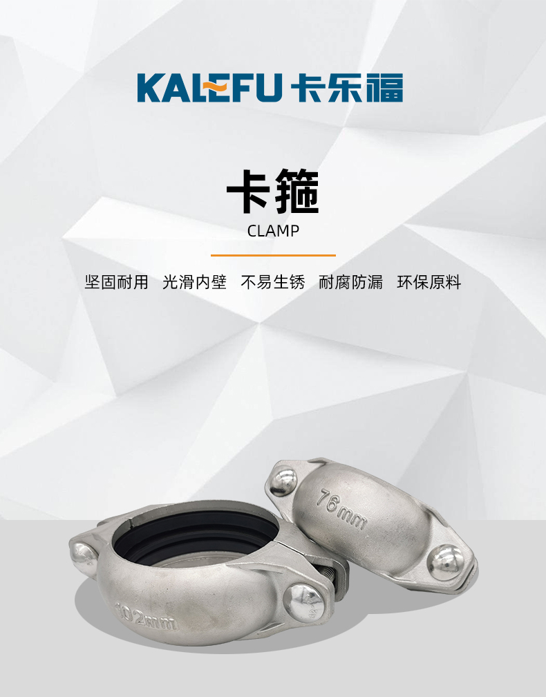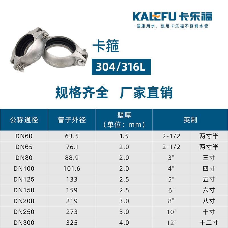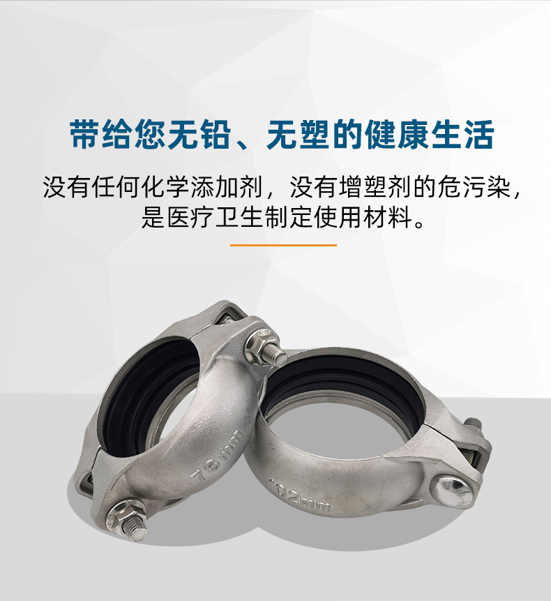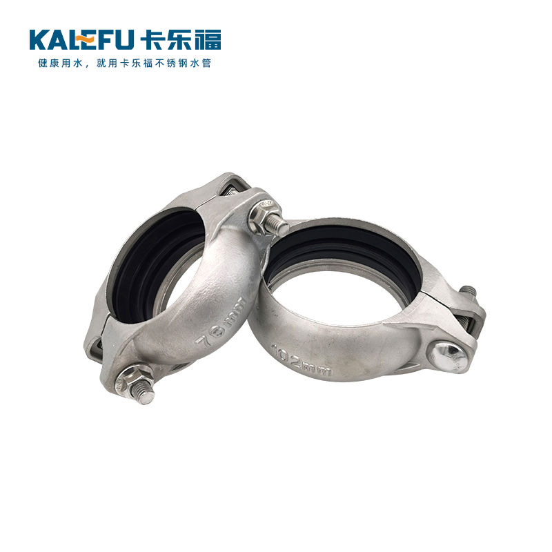 不銹鋼水管溝槽管件,溝槽式卡箍,采用304 316L食品級不銹鋼材質,DN60-DN300通徑。本不銹鋼水管溝槽管件,溝槽式卡箍執行標準CJ/T 152-2016.