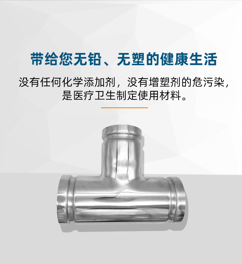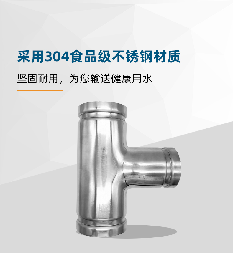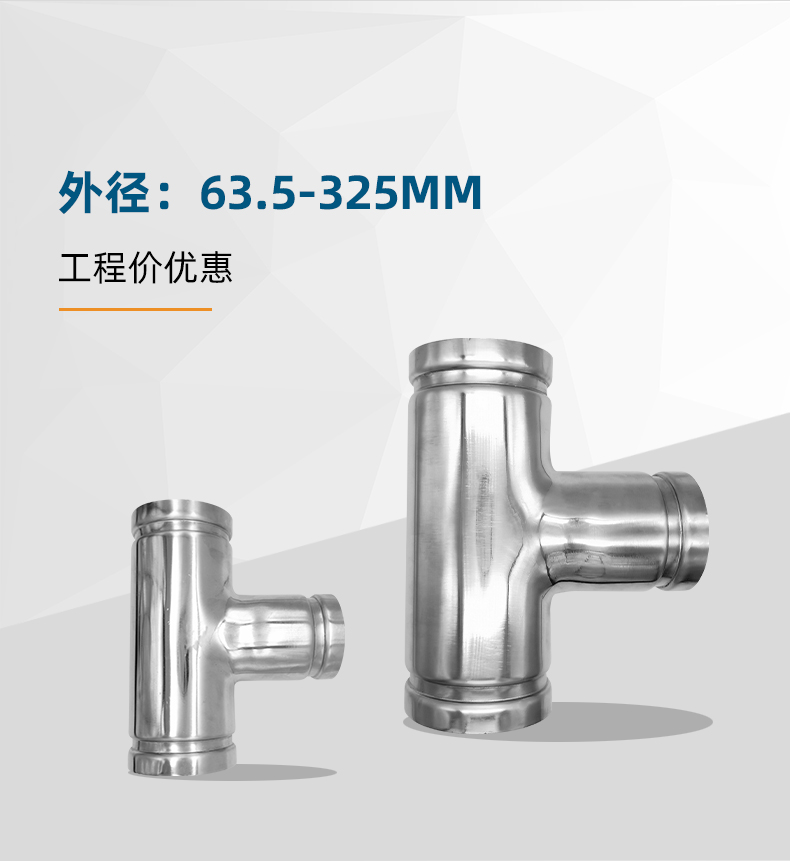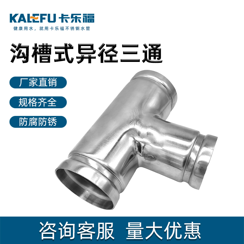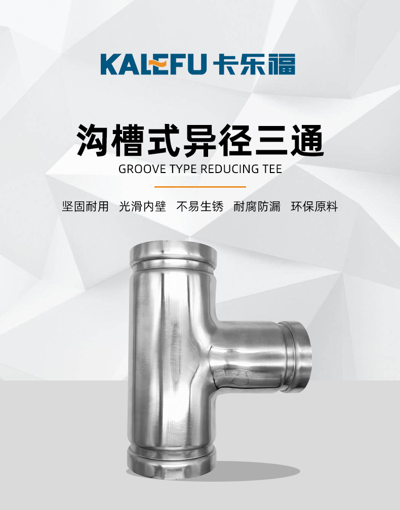 不銹鋼水管溝槽管件,溝槽式異徑三通,采用304 316L食品級不銹鋼材質,DN60-DN300通徑。本不銹鋼水管溝槽管件,溝槽式異徑三通執行標準CJ/T 152-2016.