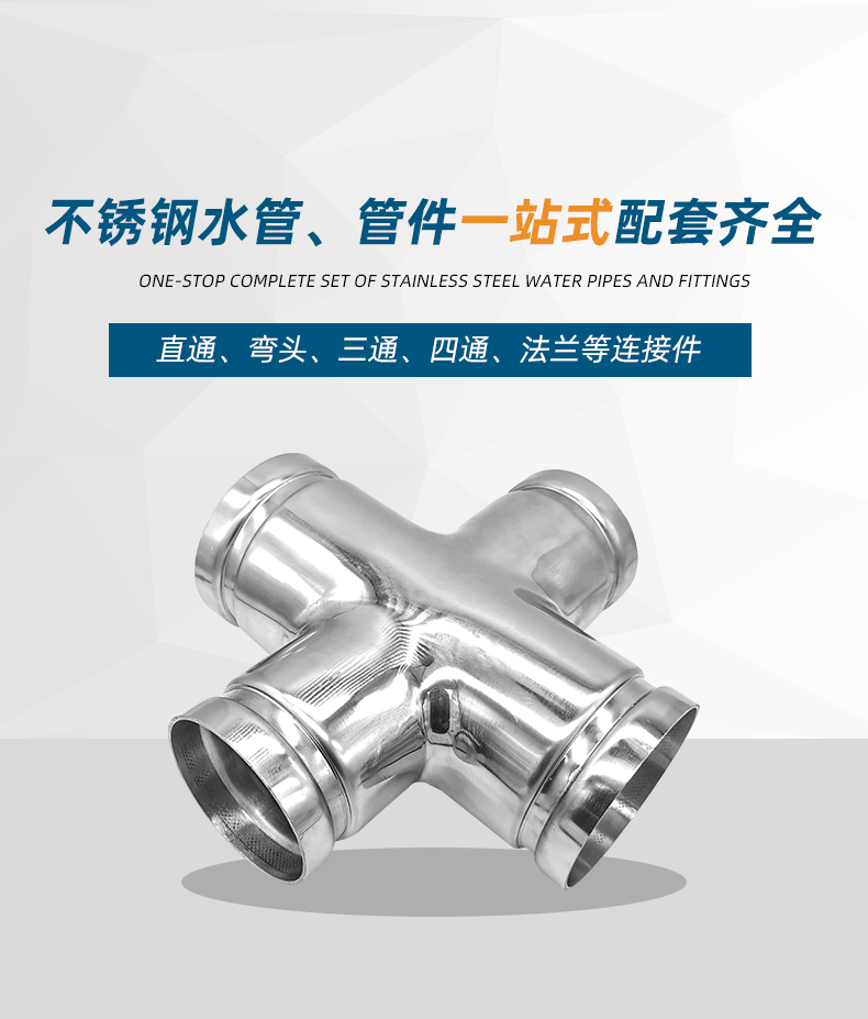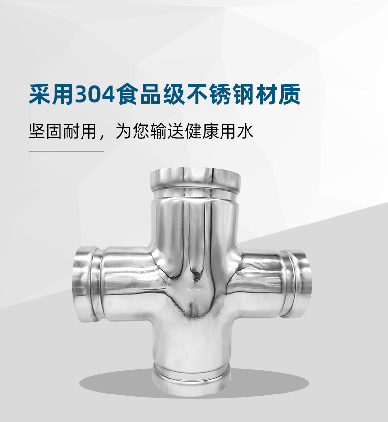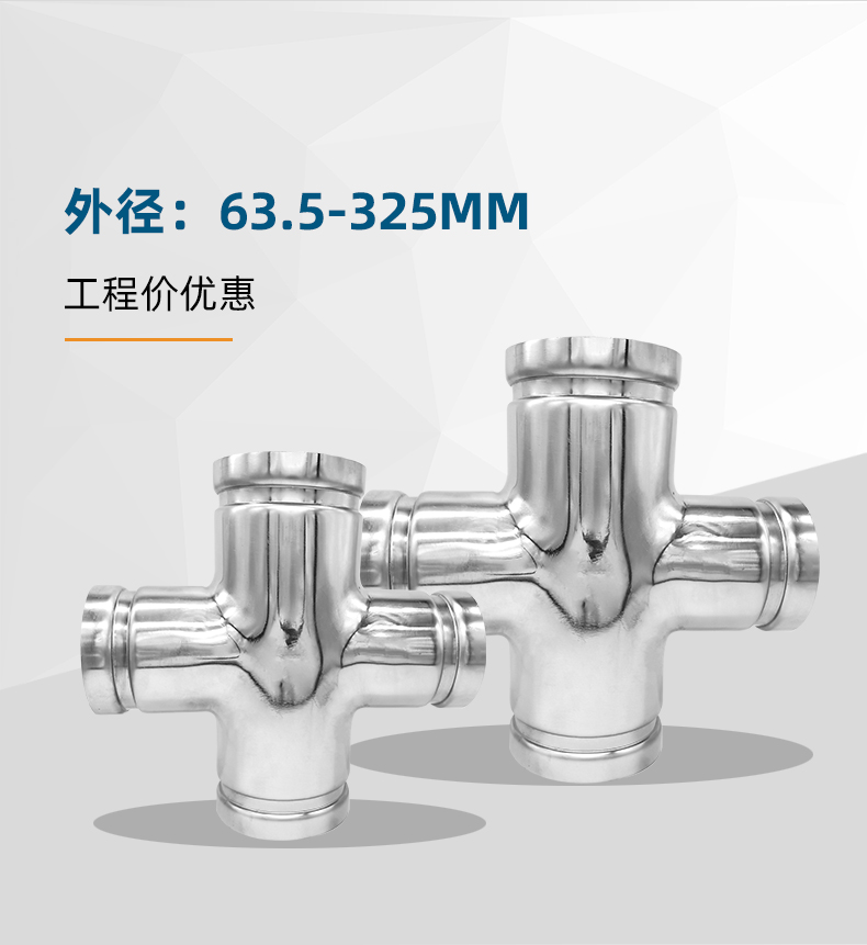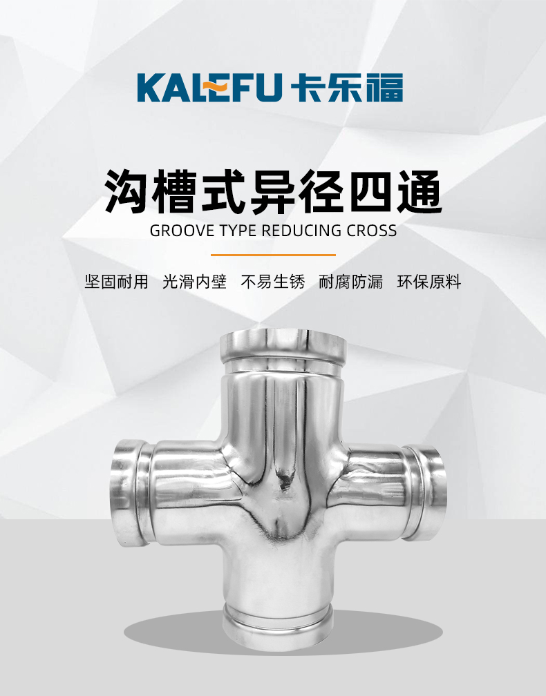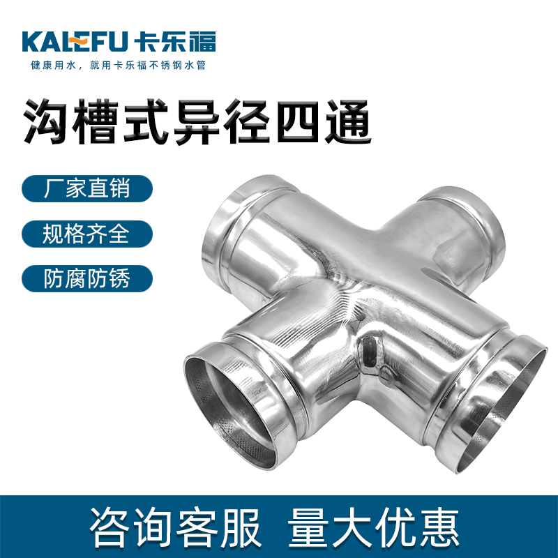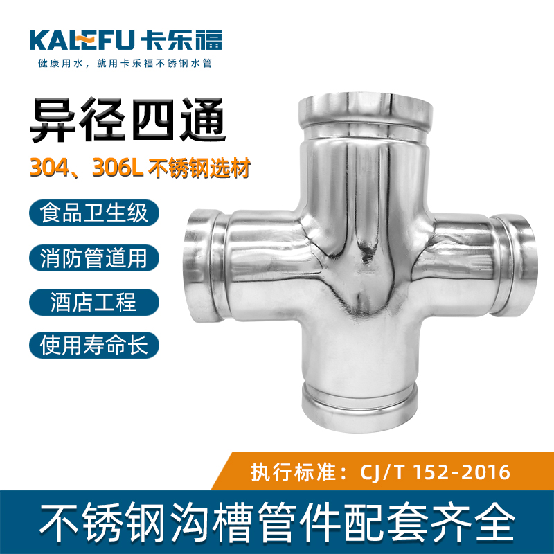 不銹鋼水管溝槽管件,溝槽式異徑四通,采用304 316L食品級不銹鋼,DIN60-DN300通徑。本溝槽式異徑四通執(zhí)行標(biāo)準(zhǔn)CJ/T 152-2016.