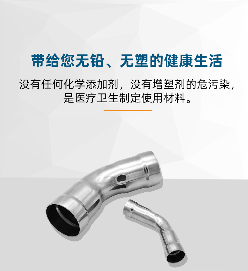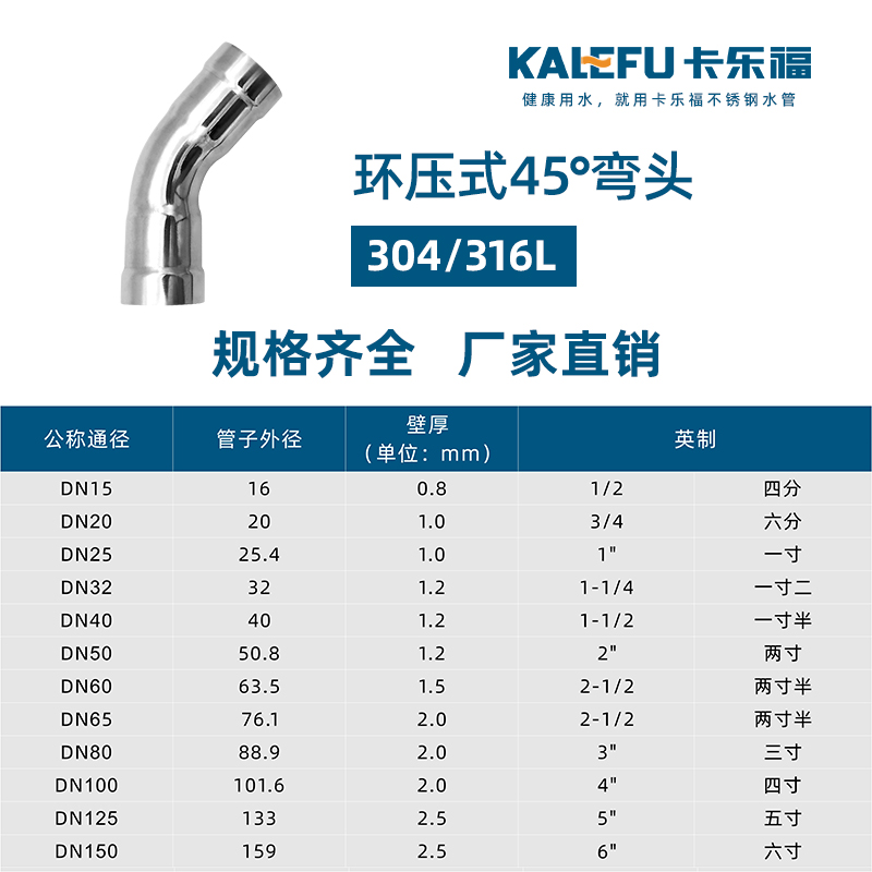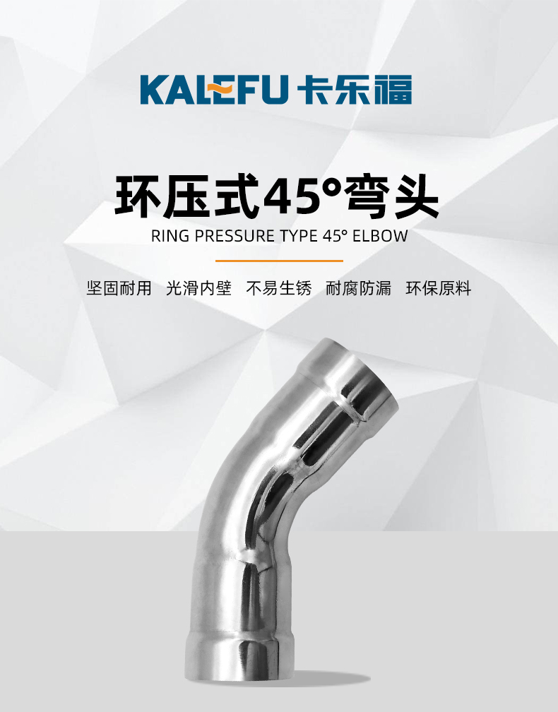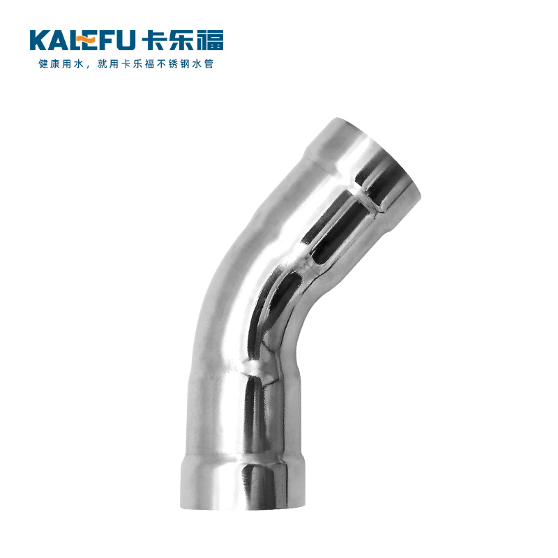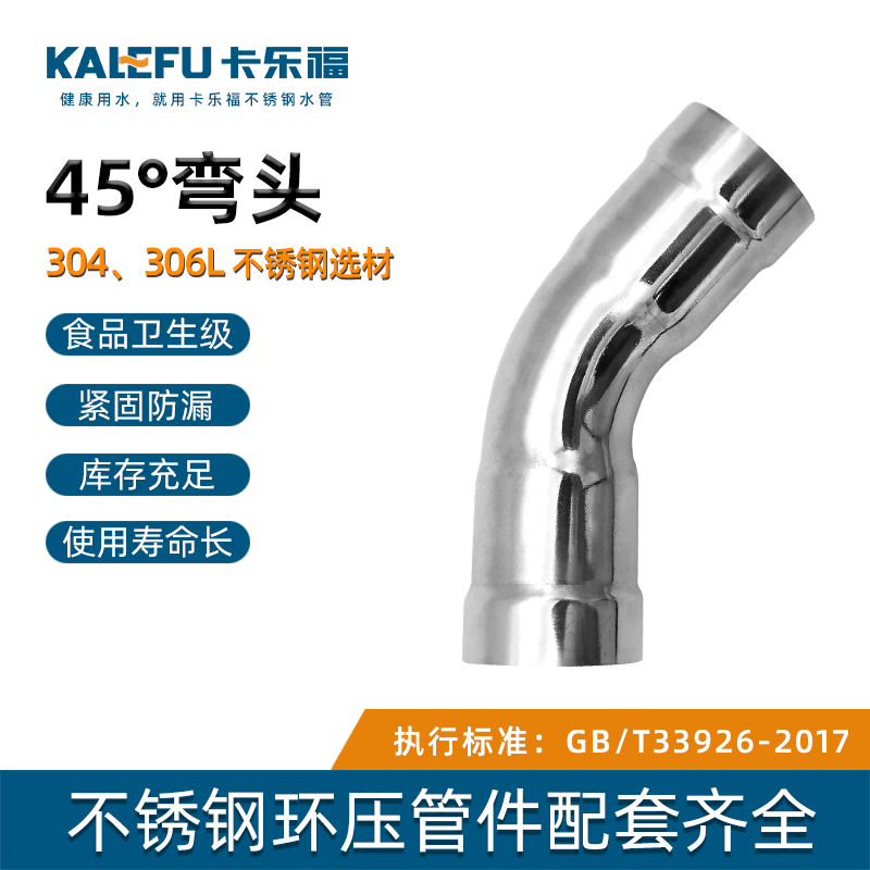 不銹鋼水管環壓式管件,環壓式45°彎頭,45度彎頭,采用304 316L食品級不銹鋼材質,DN615-DN150通徑。 本不銹鋼水管環壓式管件,環壓式45°彎頭,45度彎頭執行標準GB/T 33926-2017。