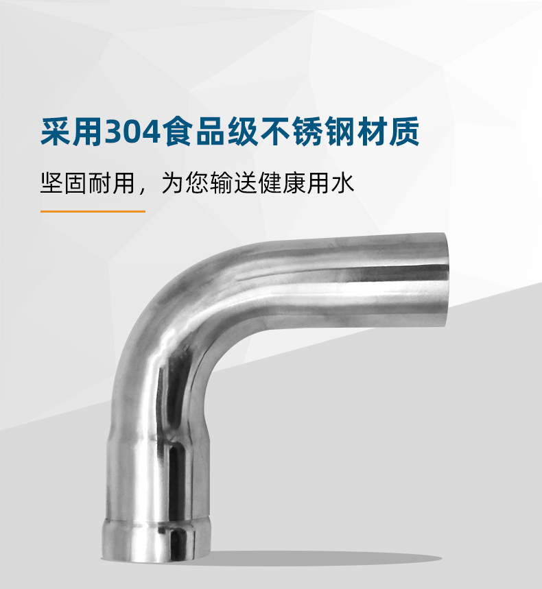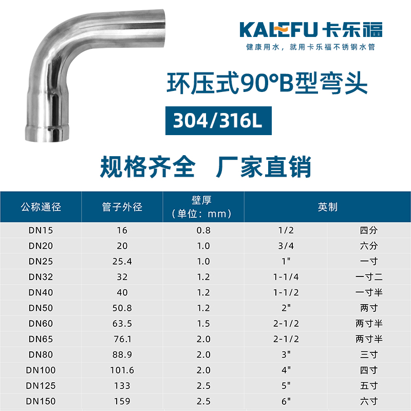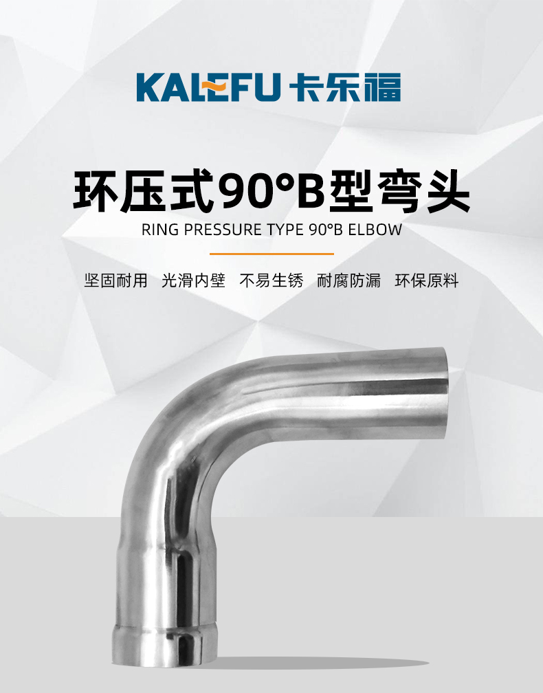 不銹鋼水管環壓式管件,環壓式90°B型彎頭,采用304 316L食品級不銹鋼材質,DN15-DN150通徑。不銹鋼水管環壓式管件,環壓式90°B型彎頭執行標準GB/T 33926-2017。