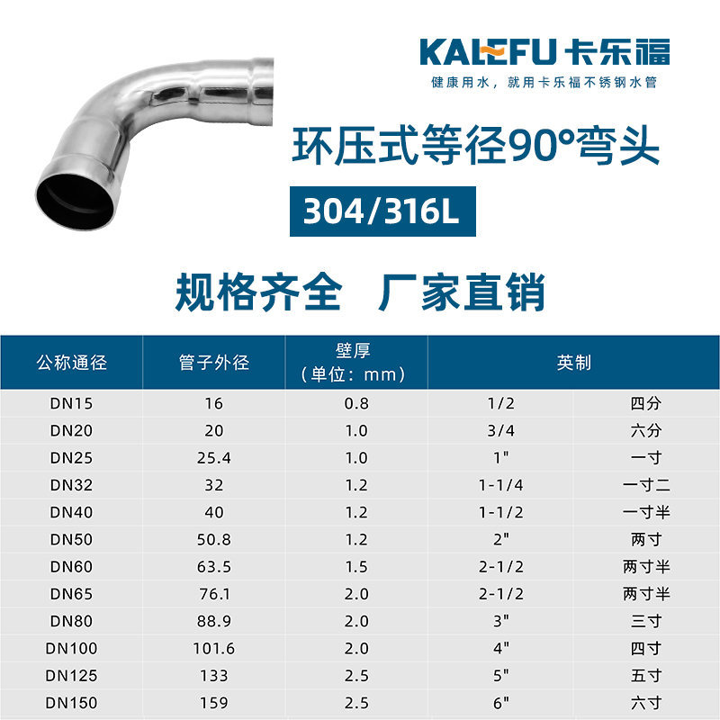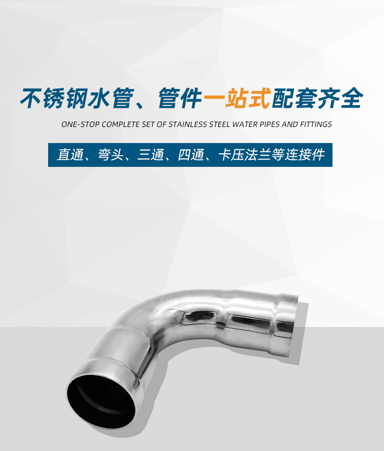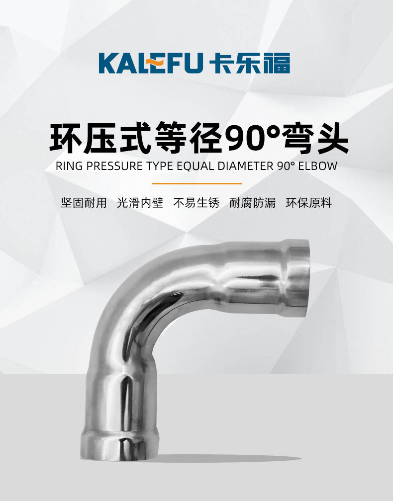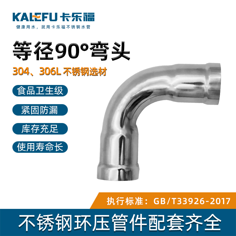 不銹鋼水管環(huán)壓式管件環(huán)壓式90°彎頭,90度彎頭,采用304 316L食品級不銹鋼材質(zhì),DN15-DN150通徑。 本不銹鋼水管環(huán)壓式管件環(huán)壓式90°彎頭,90度彎頭執(zhí)行標(biāo)準(zhǔn)GB/T 33926-2017。