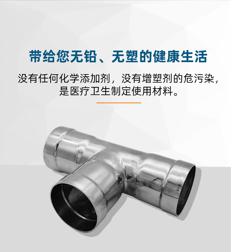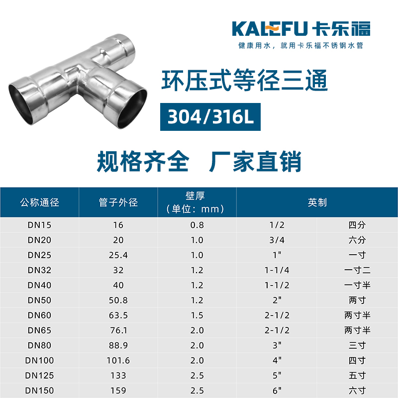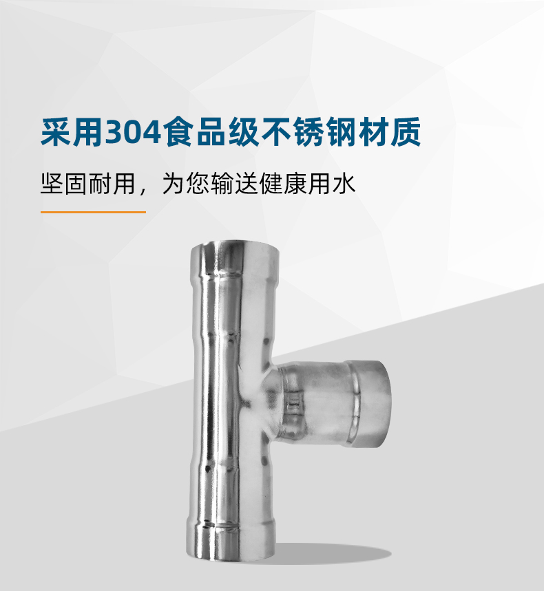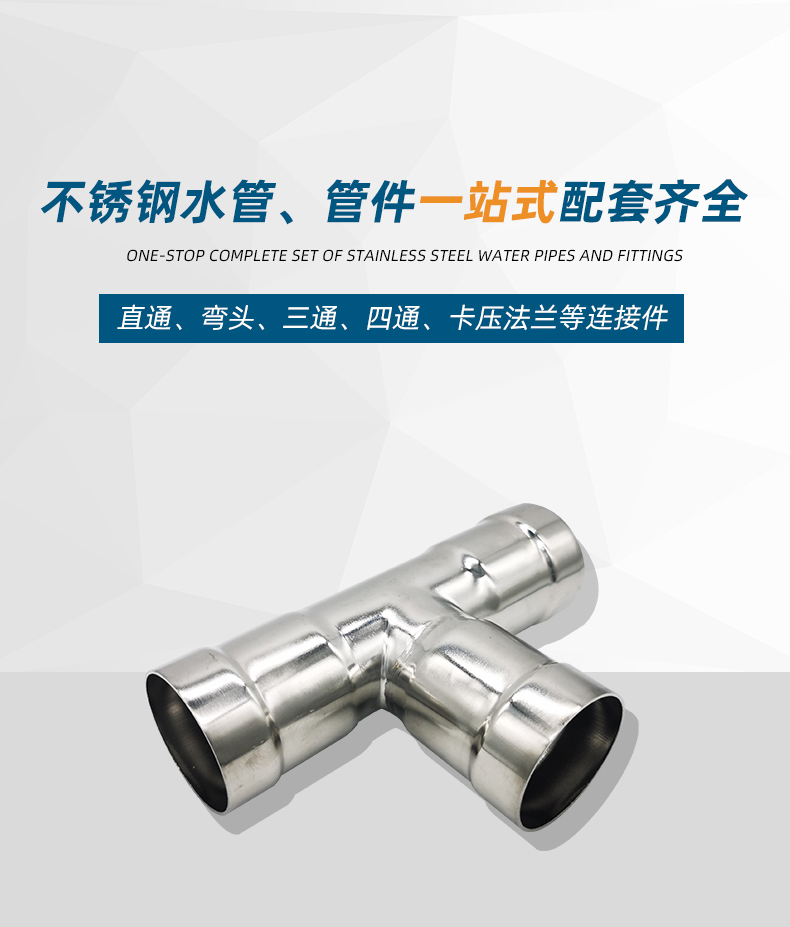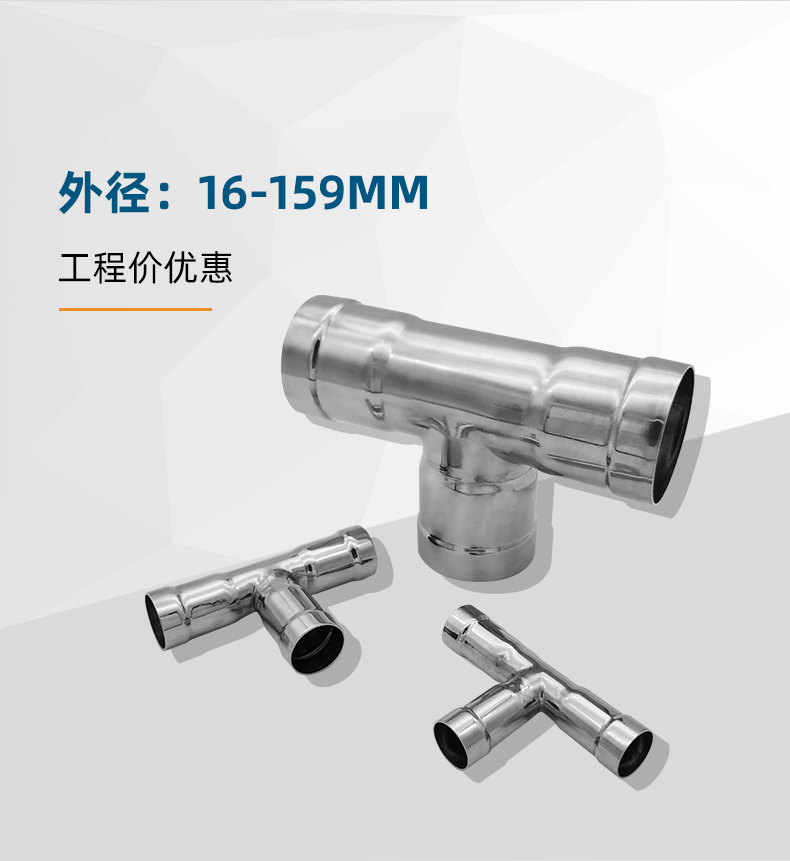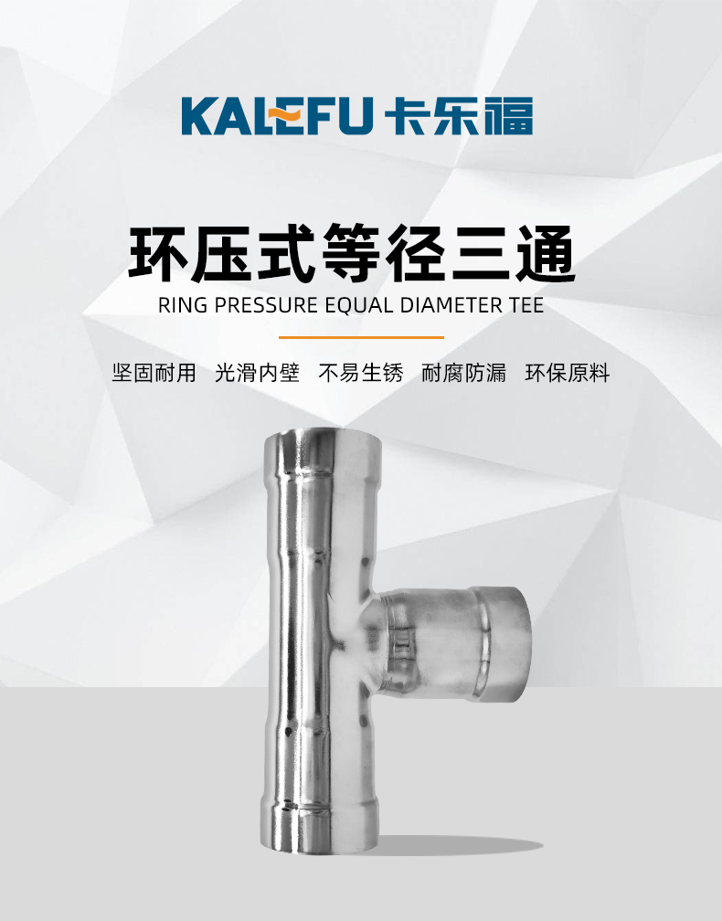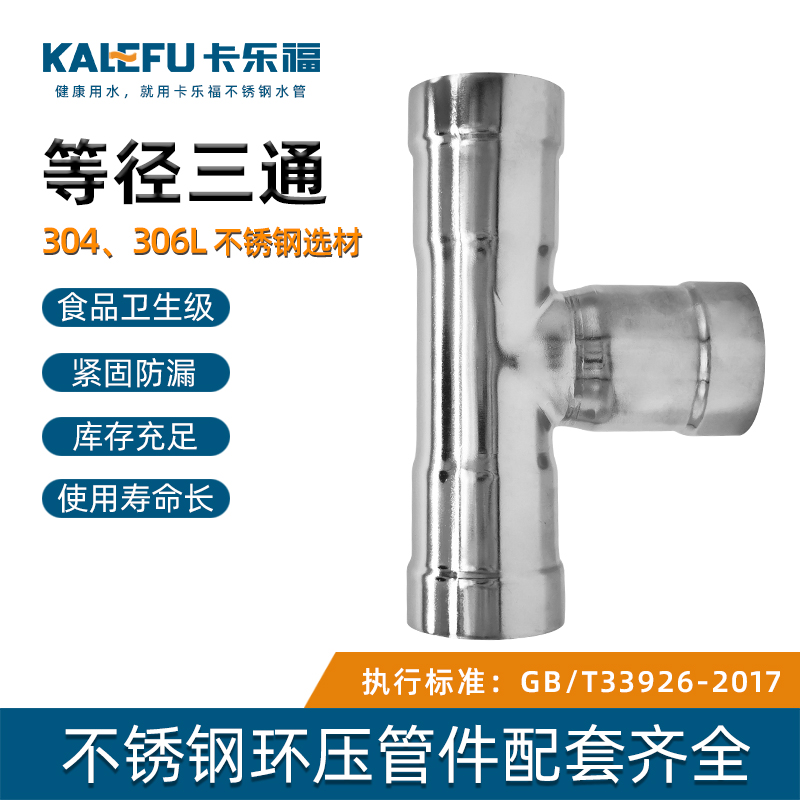 不銹鋼水管環(huán)壓式管件,環(huán)壓式等徑三通,采用304 316L食品級(jí)不銹鋼材質(zhì),DN15-DN150通徑。本不銹鋼水管環(huán)壓式管件,環(huán)壓式等徑三通執(zhí)行標(biāo)準(zhǔn)GB/T 33926-2017。