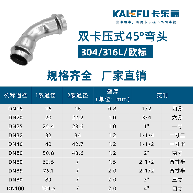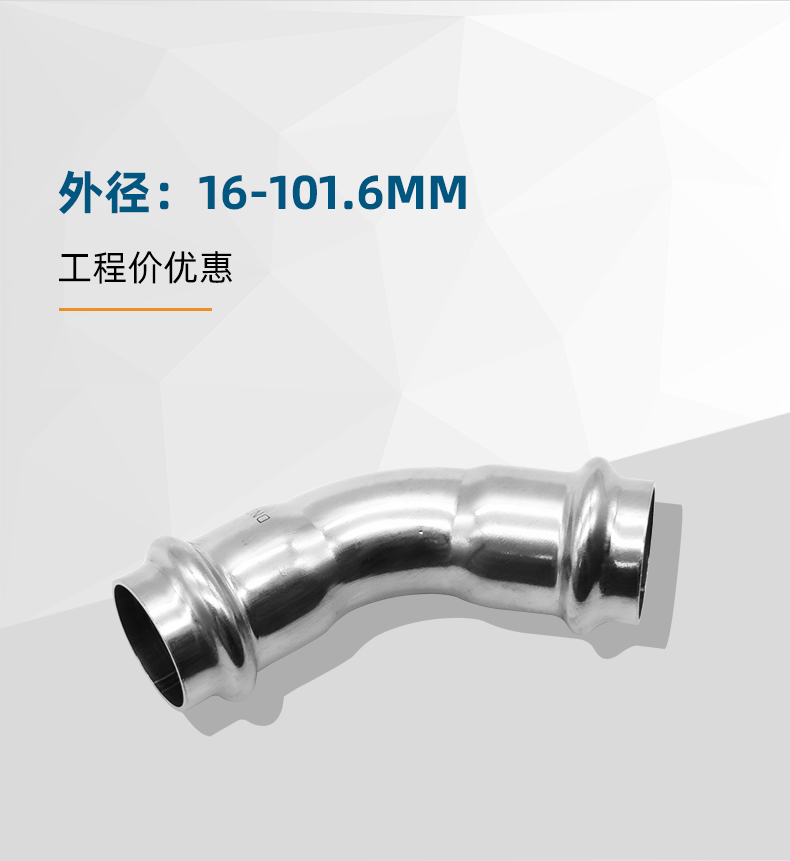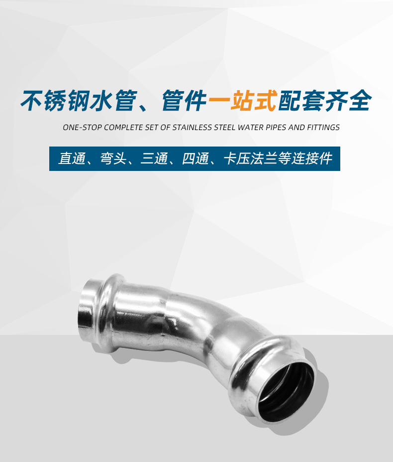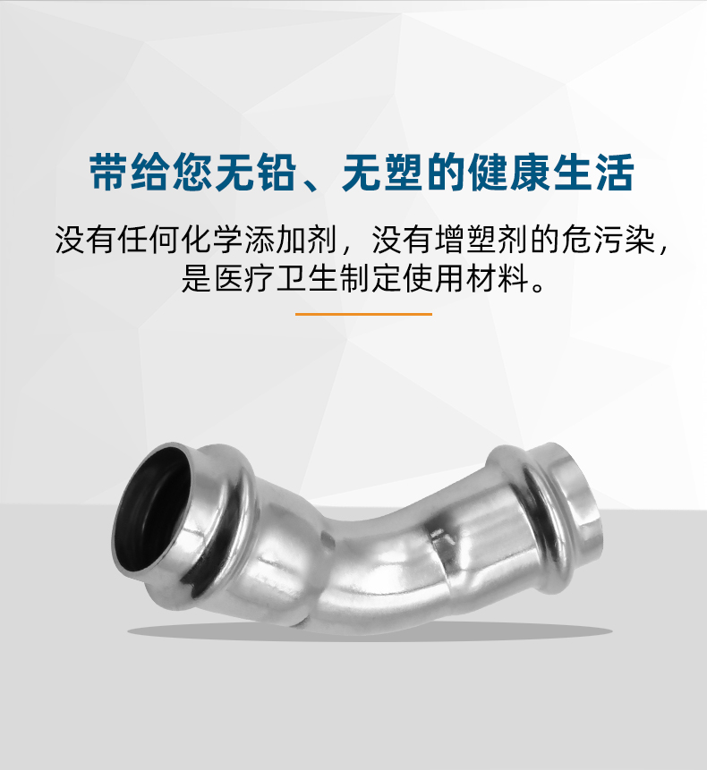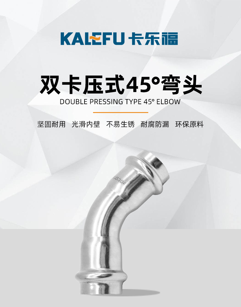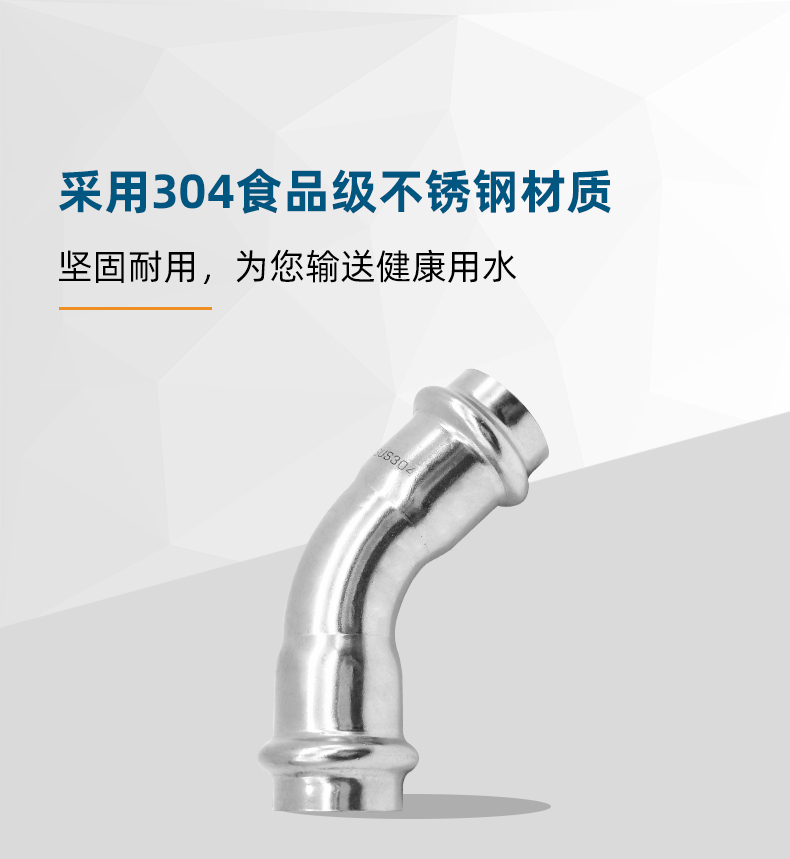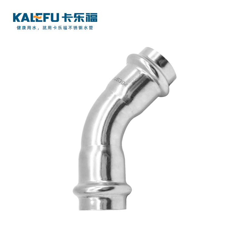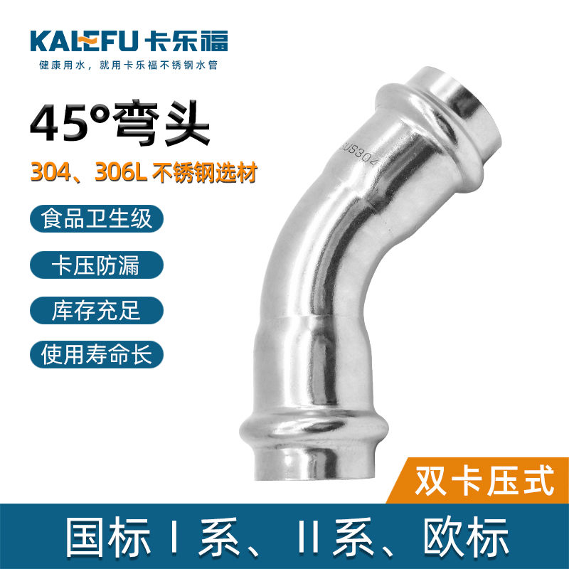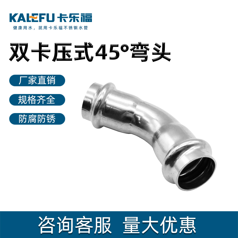 不銹鋼水管雙卡壓45°彎頭管件,304 316L不銹鋼材質,DN15-DN100通徑。本不銹鋼水管雙卡壓45°彎頭管件符合國標I系,國標II系,歐標。