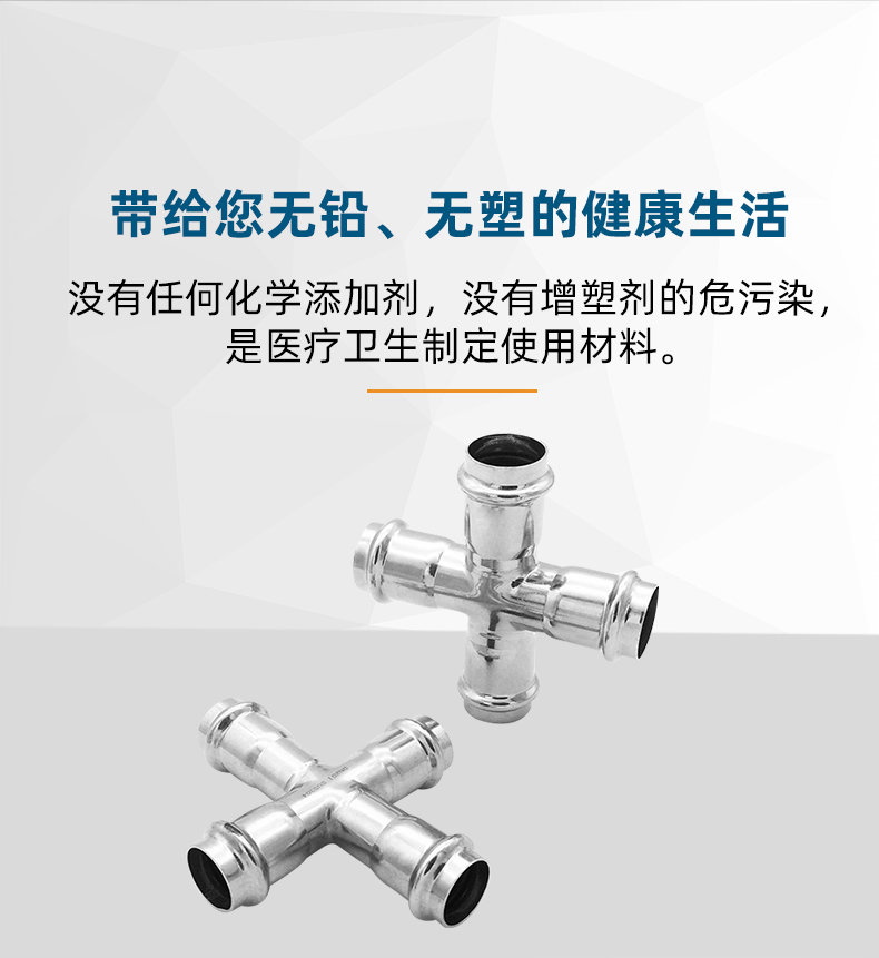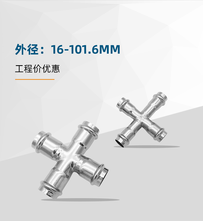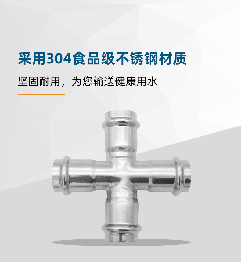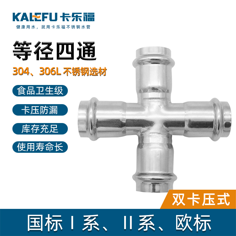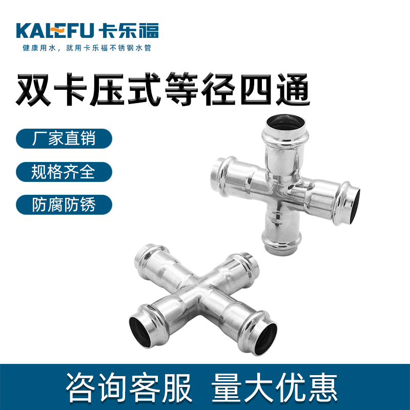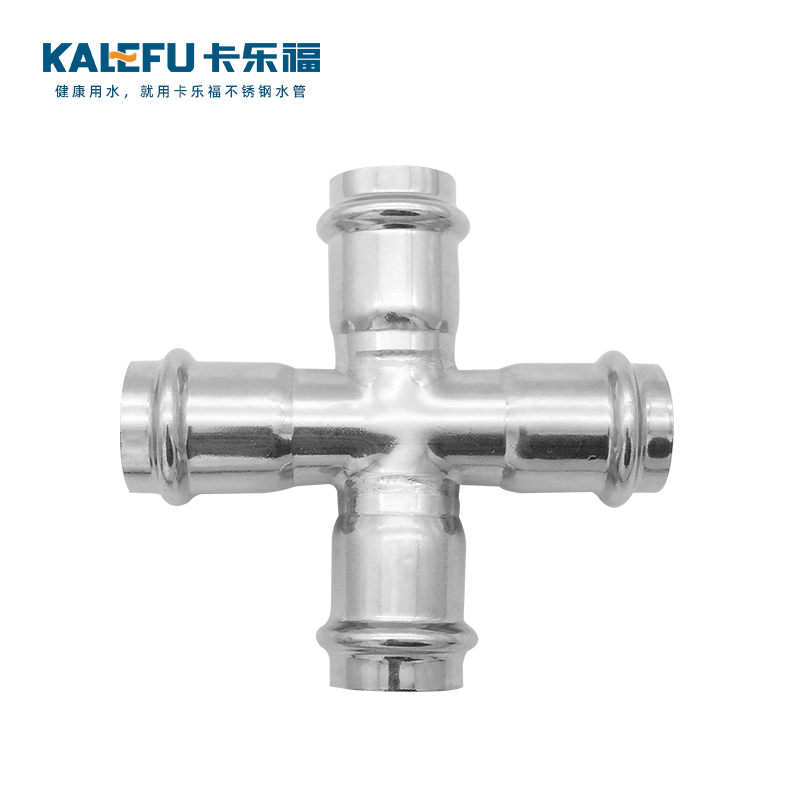 不銹鋼水管雙卡壓式等徑四通管件,雙卡壓管件,304 316L不銹鋼材質,DN15-DN100通徑。本不銹鋼水管雙卡壓式等徑四通管件符合符合國標I系,國標II系,歐標。