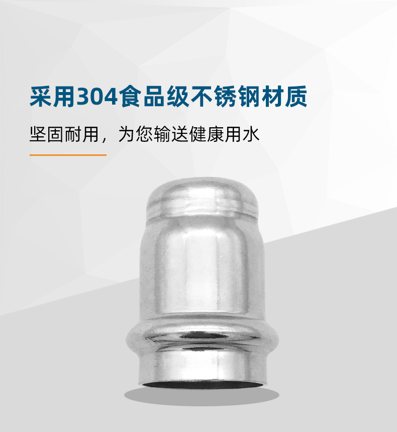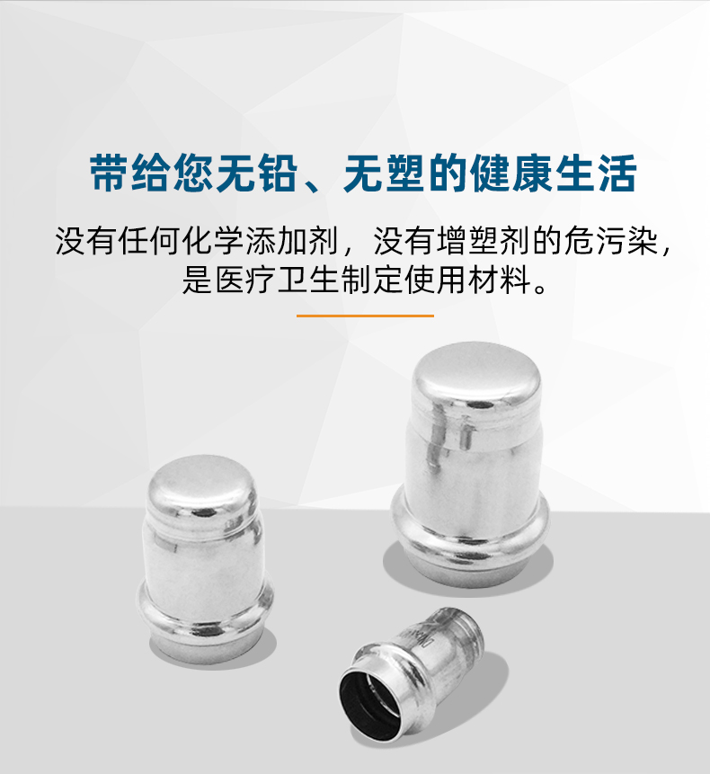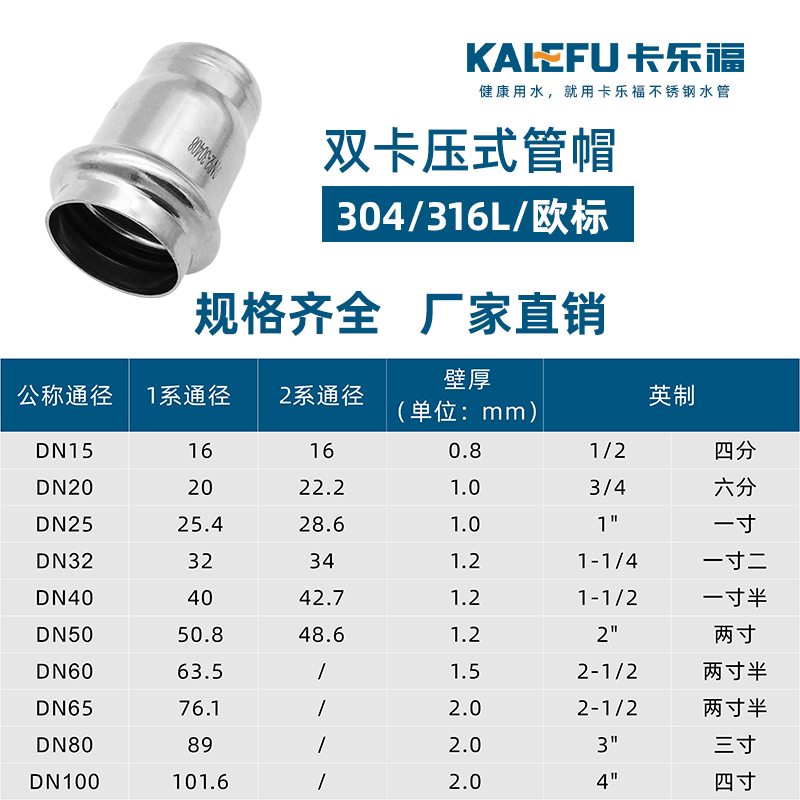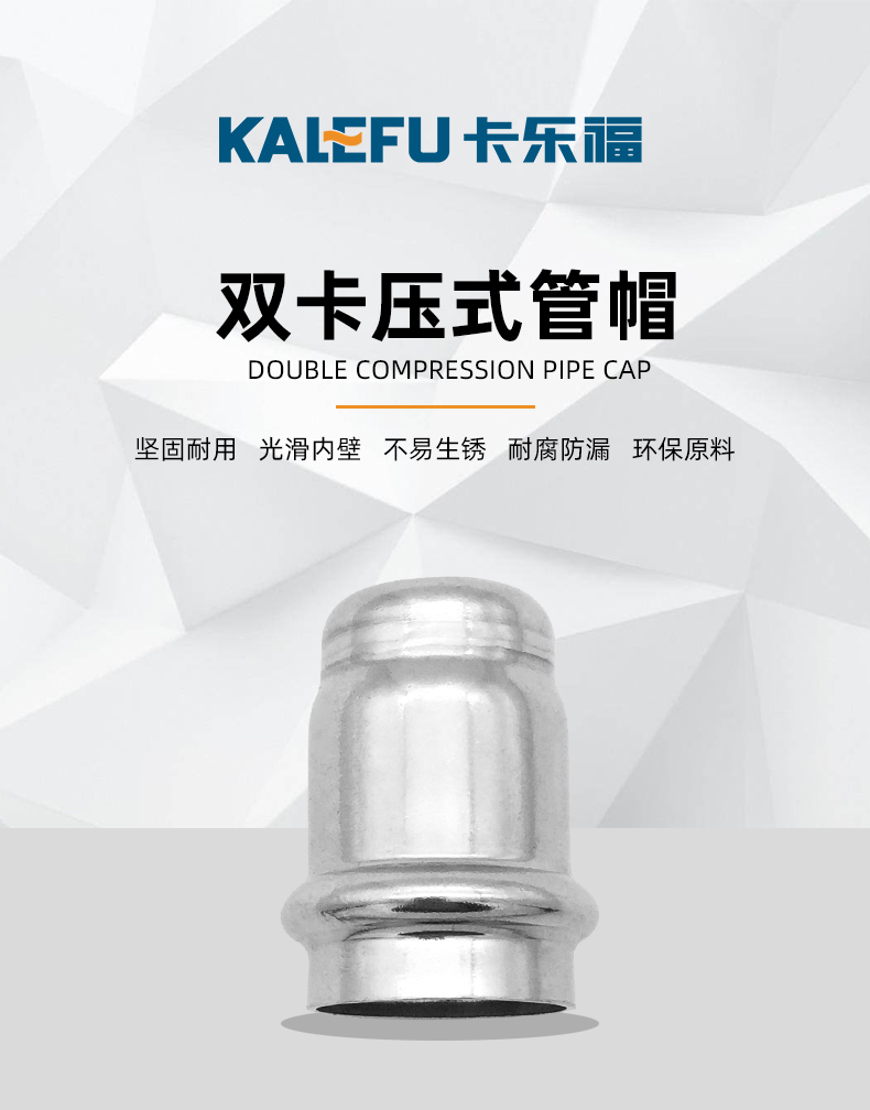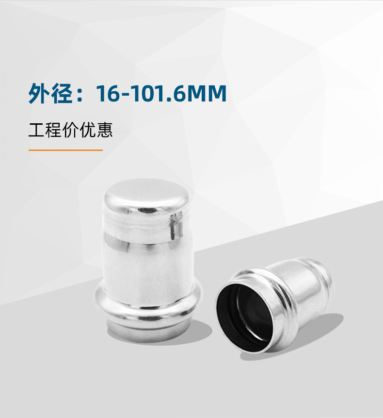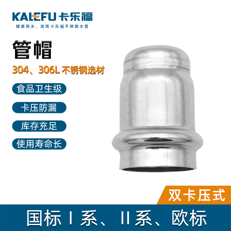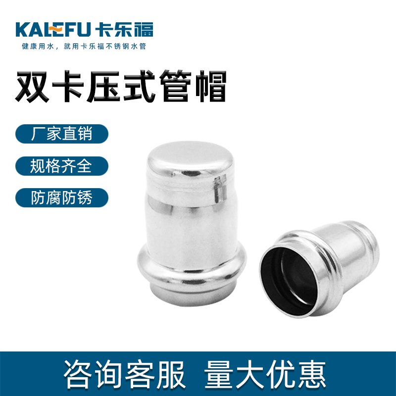 不銹鋼水管雙卡壓式管帽,雙卡壓管件,304 316L不銹鋼材質,DN15-100通徑。本不銹鋼水管雙卡壓式管帽符合國標I系,國標II系,歐標。