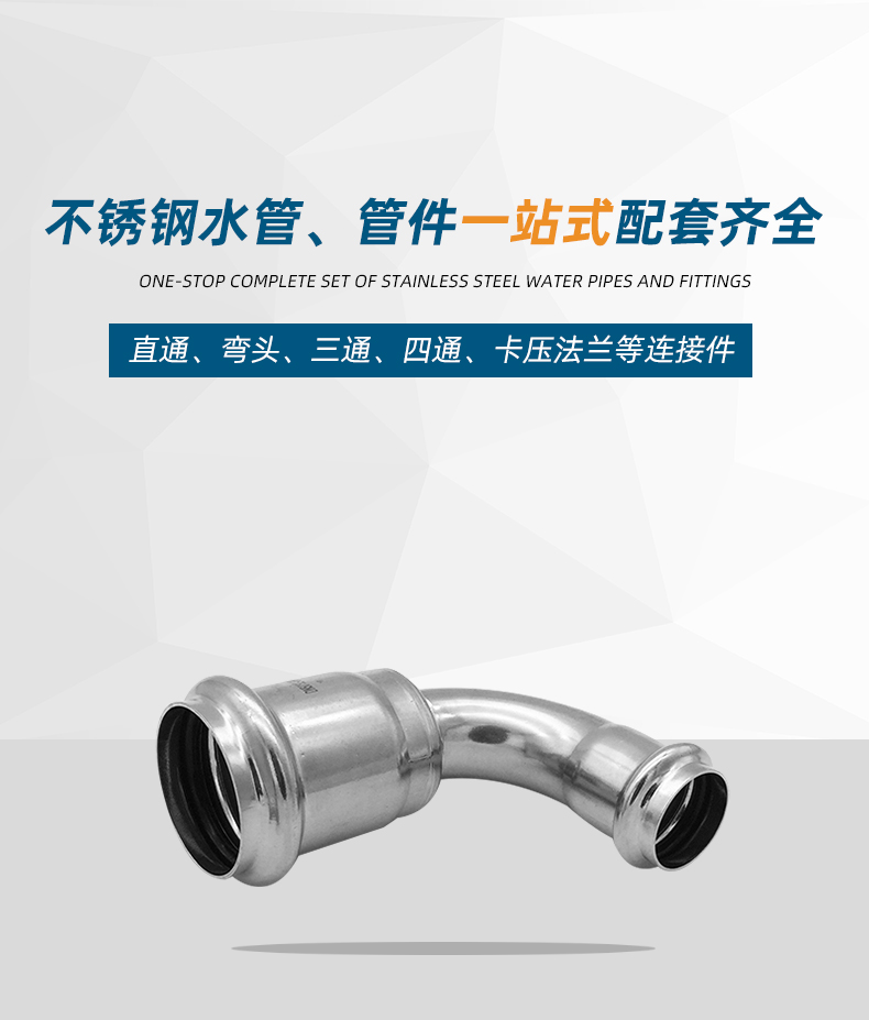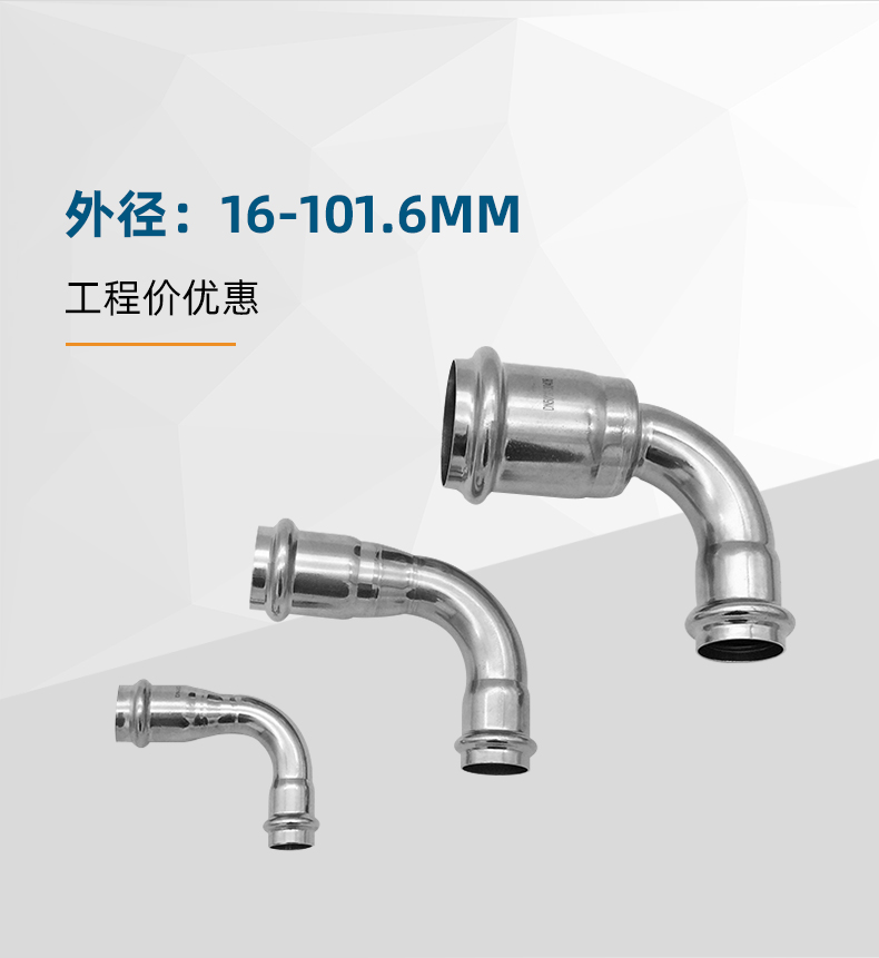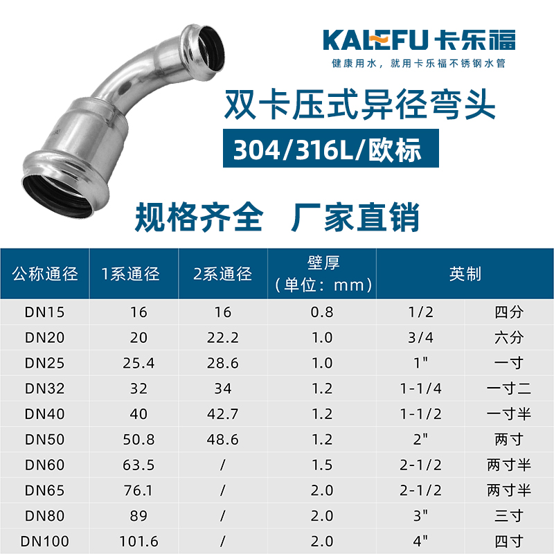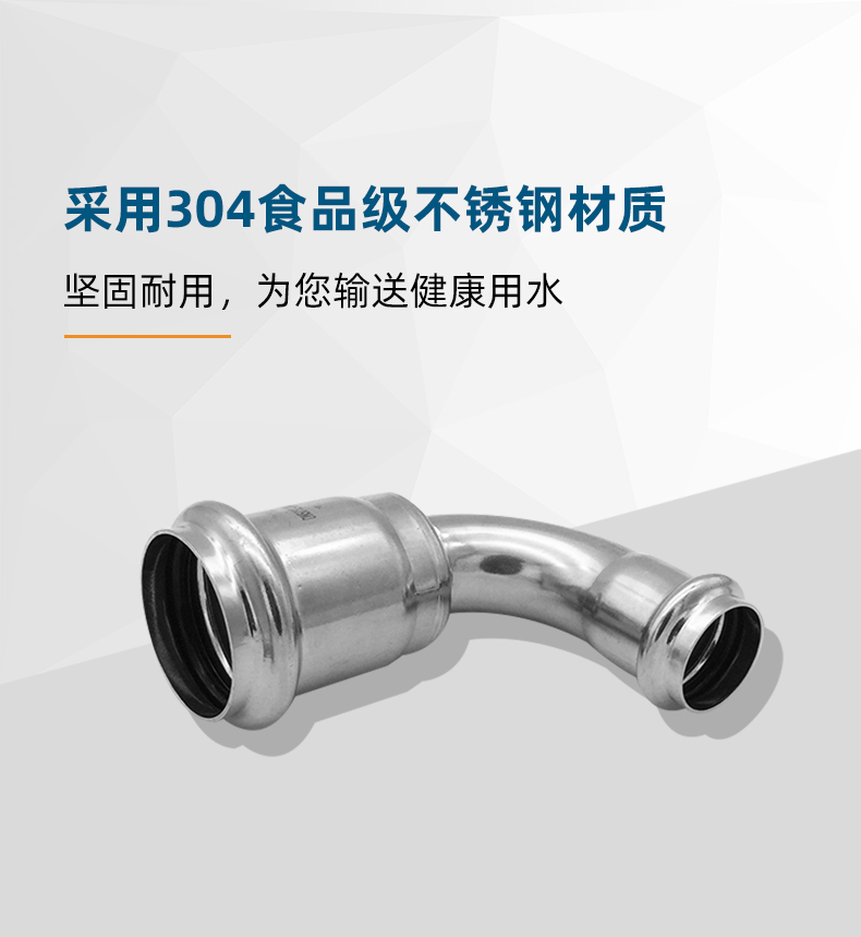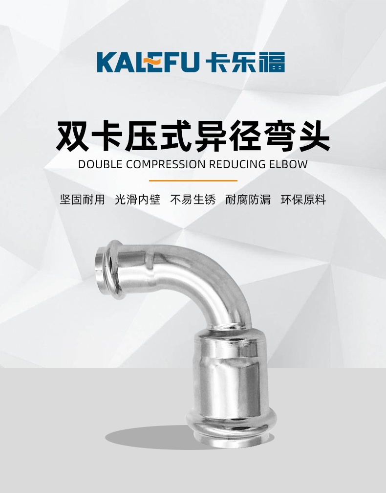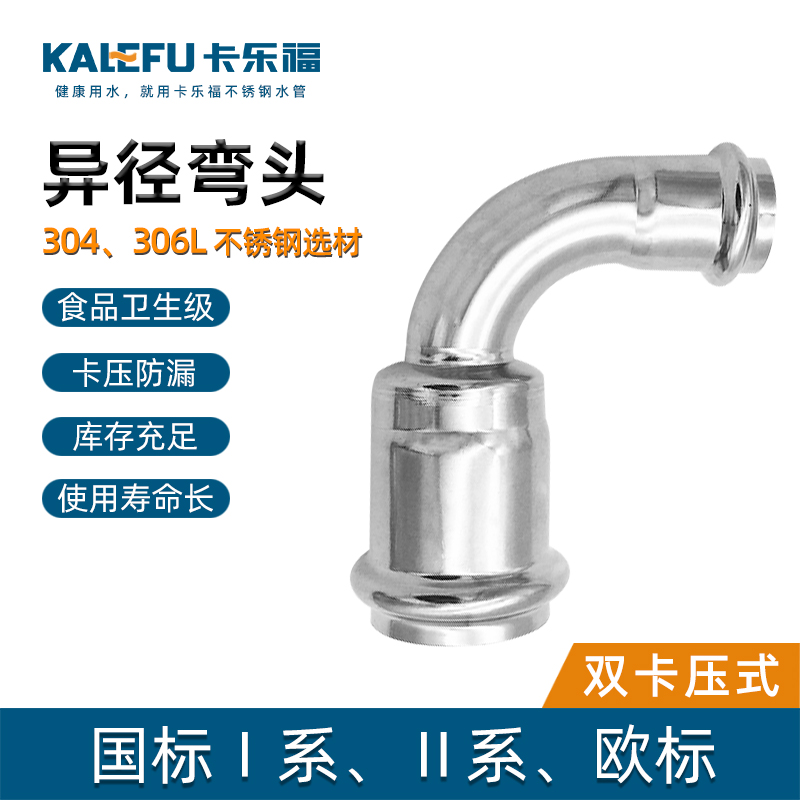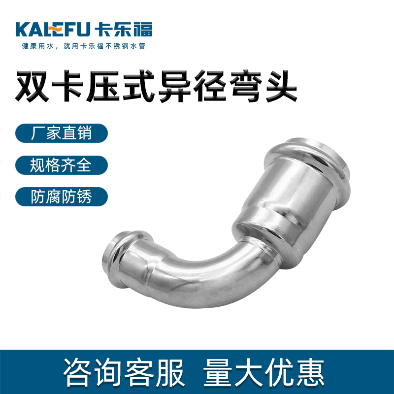 不銹鋼水管雙卡壓管件,不銹鋼水管雙卡壓式異徑彎頭,304 316L不銹鋼材質,堅固耐用,光滑內壁,不易生銹,耐腐防漏。